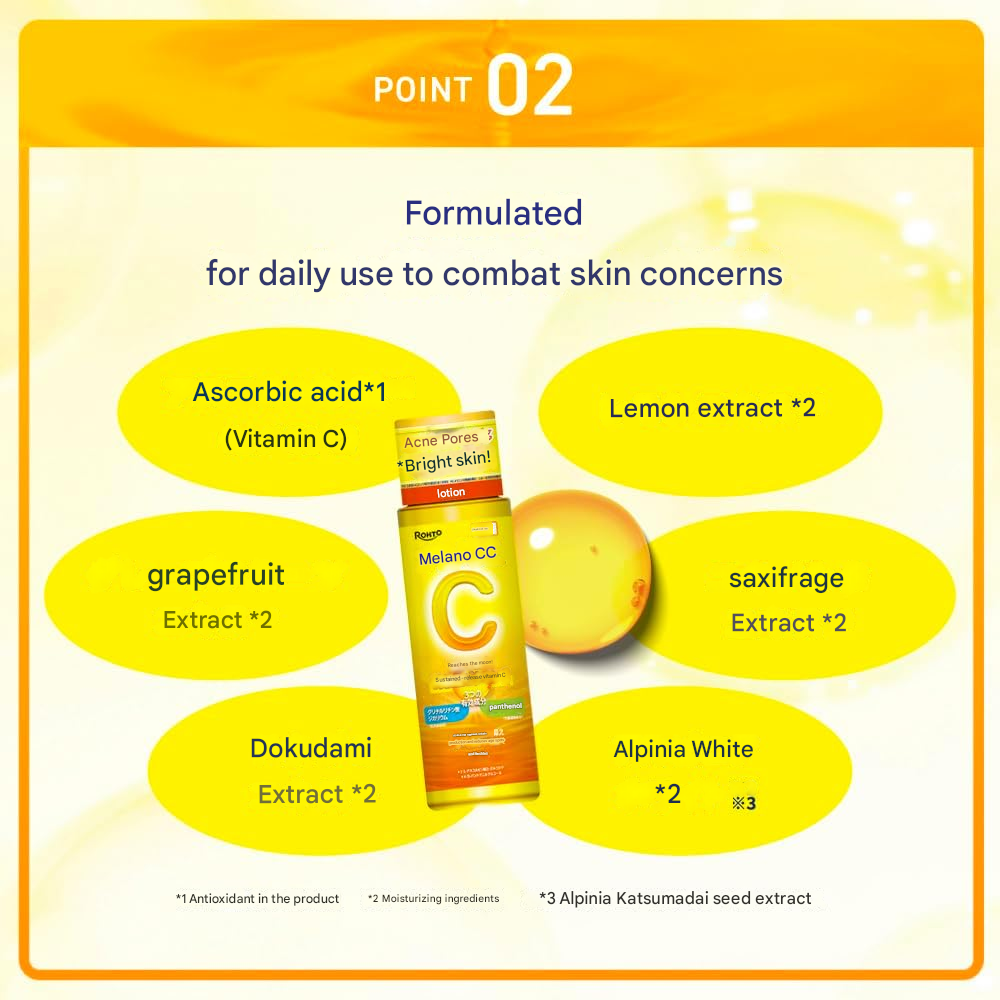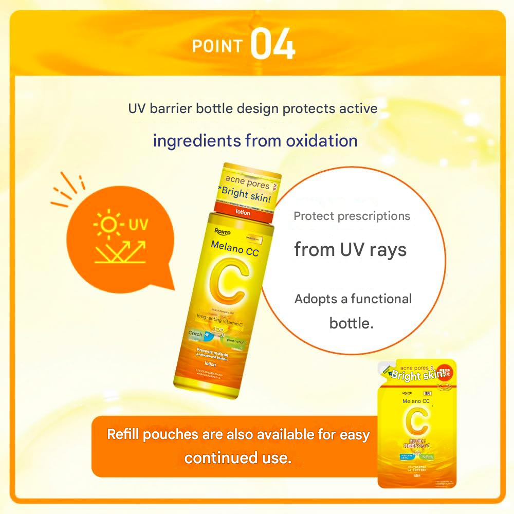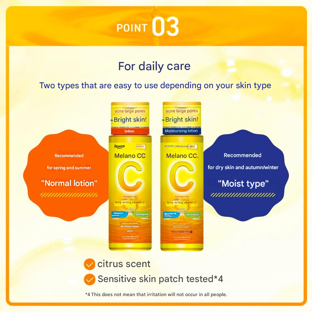 Achieve clearer, brighter, and more even-toned skin with Melano CC Medicated Stain Prevention Whitening Lotion (Moist). Formulated with active Vitamin C derivatives, this medicated lotion helps suppress melanin production to prevent dark spots and freckles while delivering long-lasting hydration.
